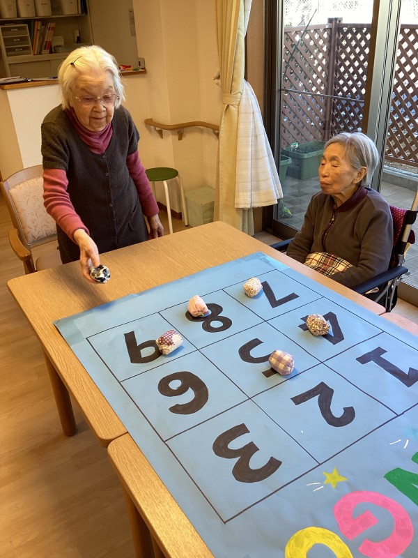 1人6個ずつお手玉を持ち、数字目掛けて投げビンゴを狙います。