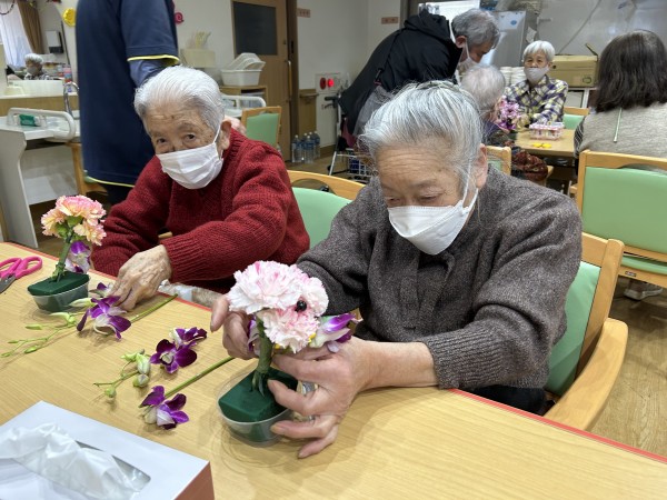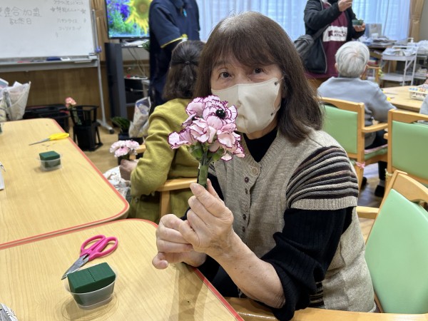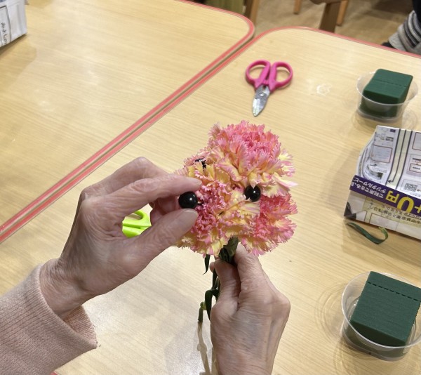 4本のカーネーションには、先生が徹夜で(??)フローラルテープを巻いて下さり、既にワンちゃんのお顔のように見えましたが…