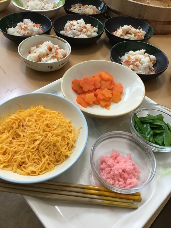 錦糸卵、絹さや、桜でんぶ、型抜きした人参を盛り付けていただきました(*^^*)