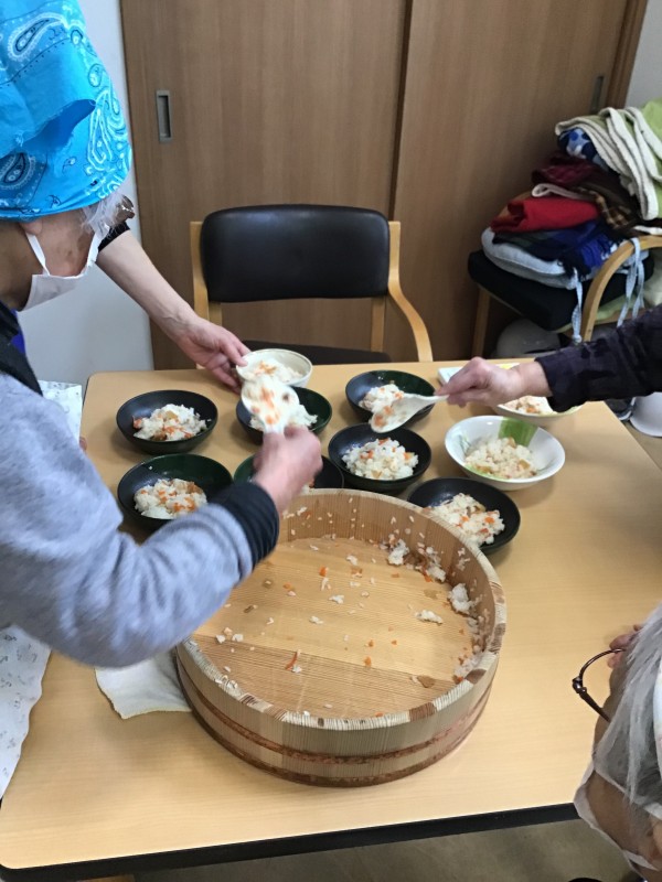 ちらし寿司を作っていただいています。ご飯と具をしっかり混ぜていただいたら、盛り付けをしていただきます。