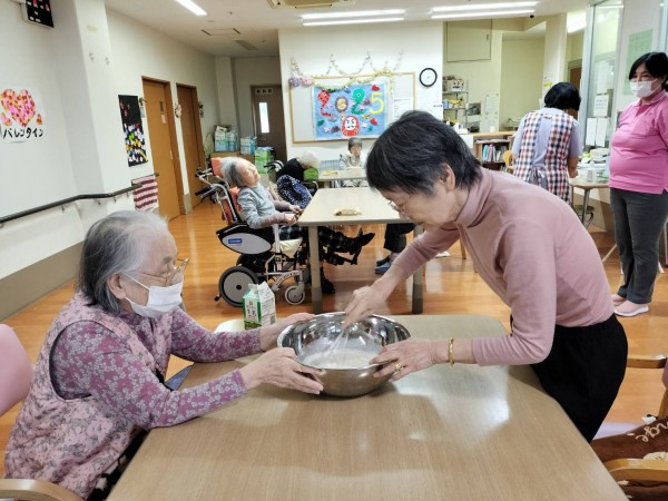 みんなでフルーチェ作りをしました。 大きなボールにフルーチェ、牛乳を入れみんなでかき混ぜました。