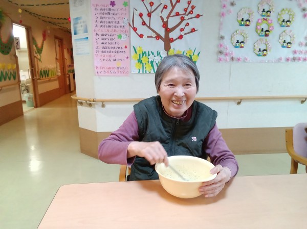 楽しい!とボウルを抱えて粉をまぜまぜ~♪