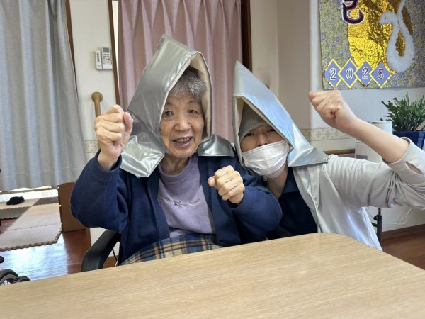 最後に、防災頭巾を被ってはい、チーズ(*^_^*)v