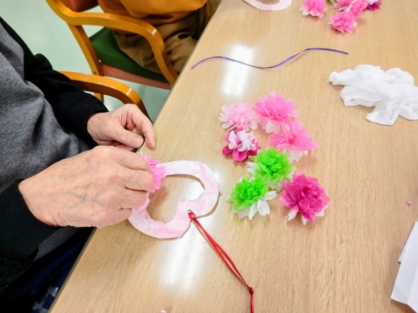 薄ピンクのお花紙を貼り、吊るしリボンを通してから