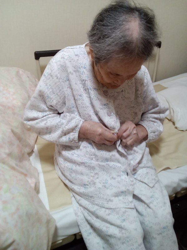 声掛けやお手伝いをさせて頂きますが、写真のように、パジャマのボタンをご自身ではめられます。