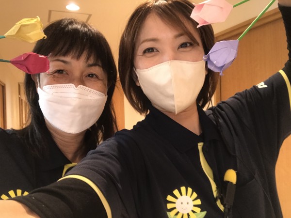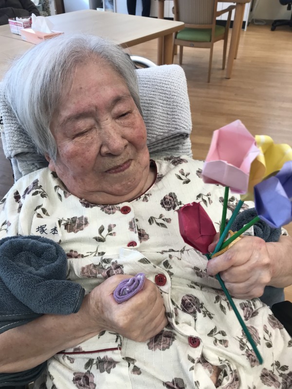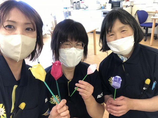 本日は午前中から皆様と折り紙でチューリップを作ってみました。