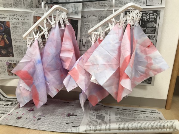 和紙を三角形に折り、色とりどりの絵の具水につけていきます。