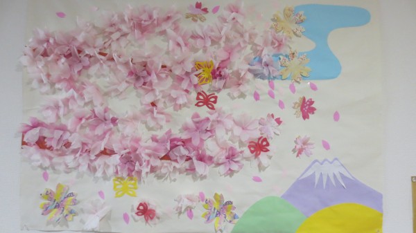 そこで、一足先にお花見気分を味わっていただくため、以前制作した“桜と富士山の壁画”を廊下の目立つ場所に飾り、写真撮影を行いました!