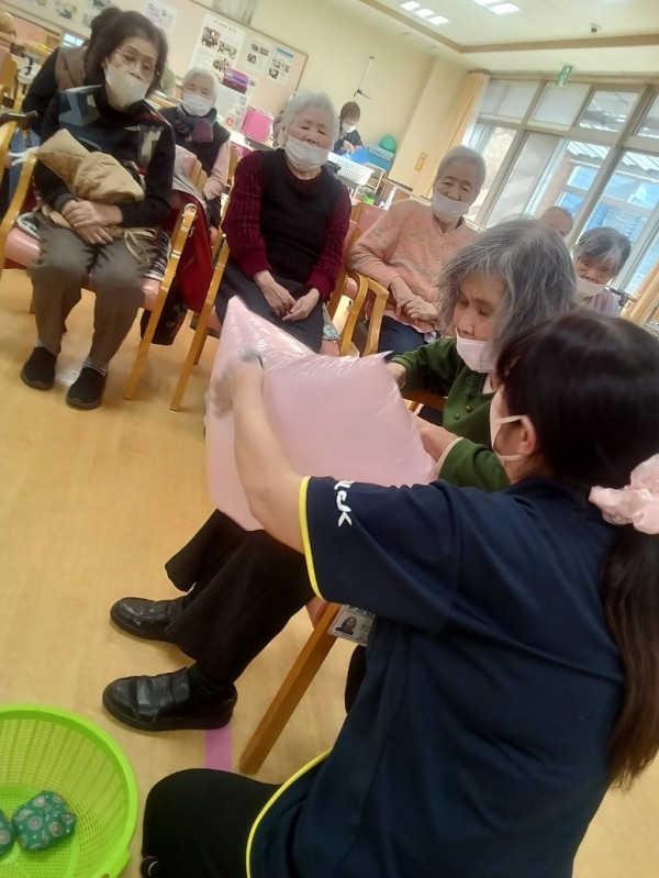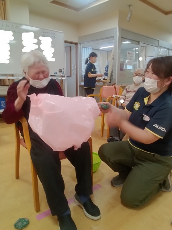 ふわふわポン!の『ふわふわ』は可愛いピンク色のビニル袋に空気を入れて作りました(*^^*)