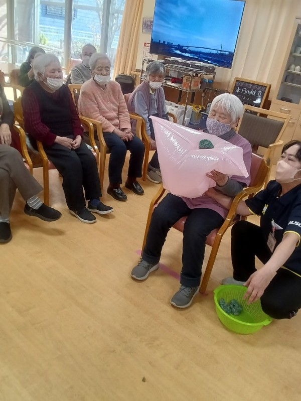 職員がビニル袋の口を縛った部分を握っているので、「一度、手を離して両側から勢い良く挟むんですよ~」と声掛けさせて頂くのですが…