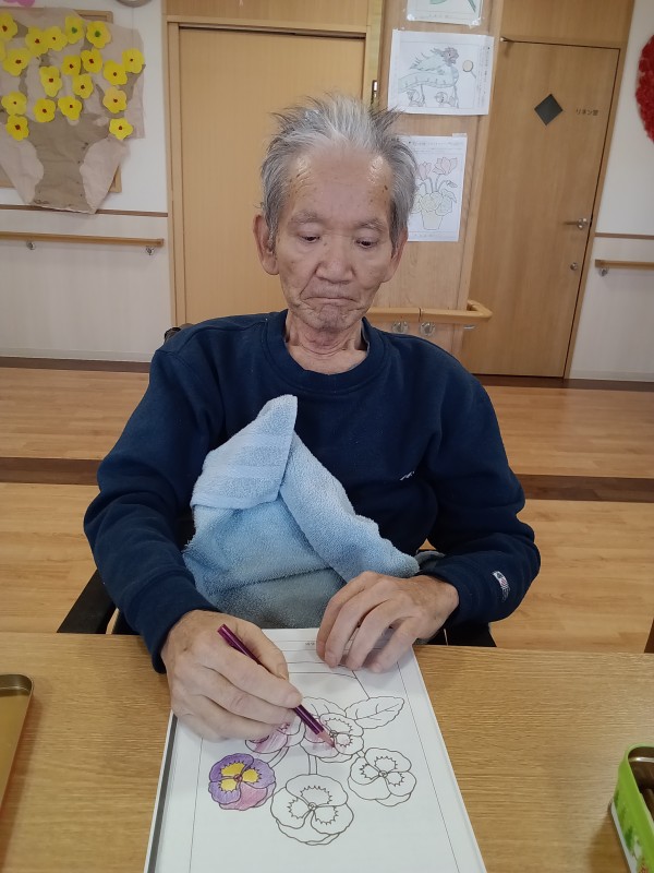 各フロアではレクの時間に時々季節のイラストのぬり絵をして楽しんでいただいております♪