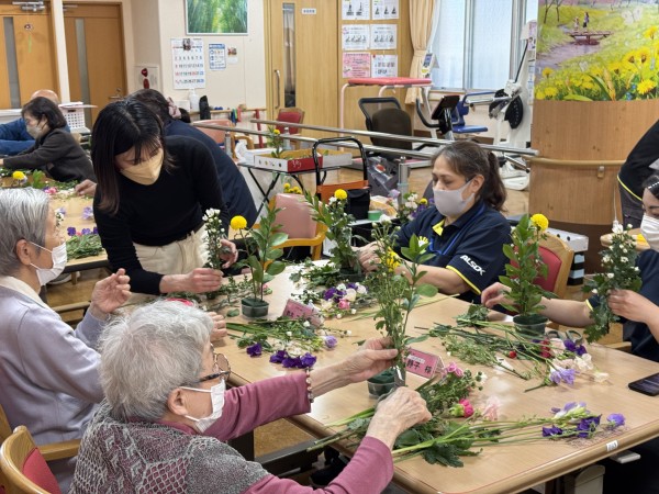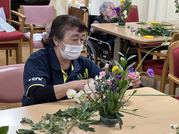 土台となる三種類のお花を皆様で活けたら、あとはご自身のセンスで飾り付けをしていきます(`・ω・´)ゞ