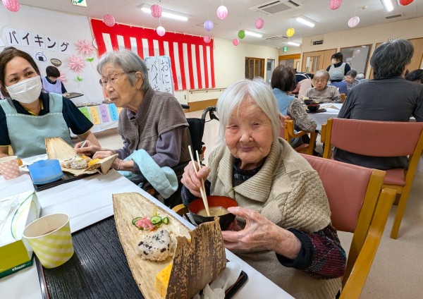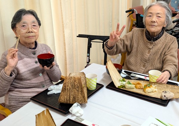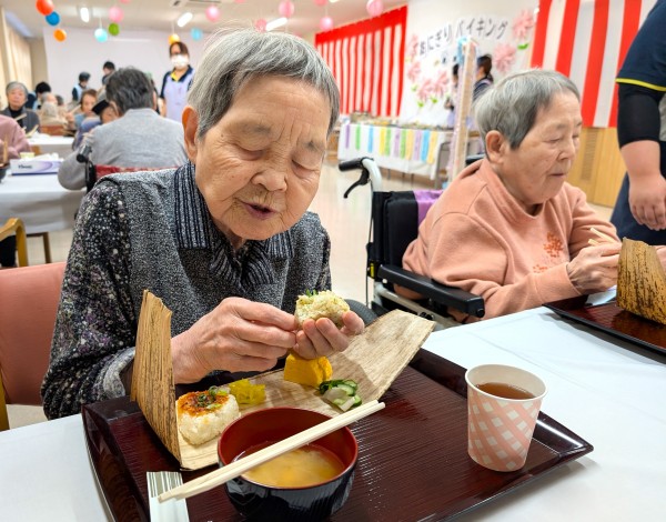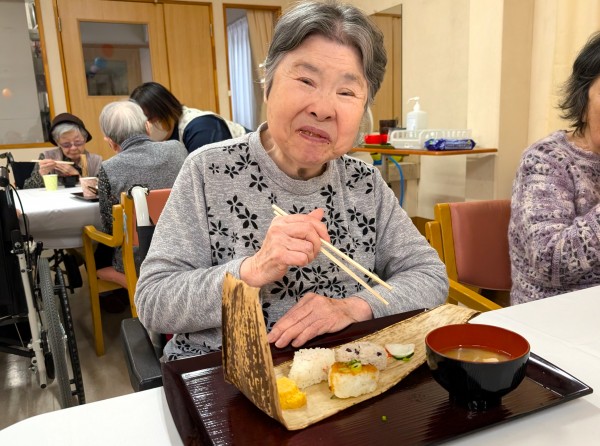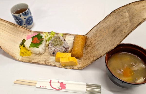 おにぎりを乗せる器に昔ながらの竹皮をご用意しました。