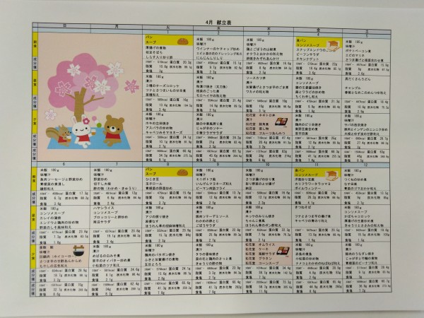 4月のメニュー表になります。