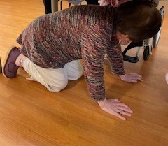 火事が起きた事を想定し、避難訓練を行います。頭を近くの人形で守ったりひざ掛けで頭を守り職員の「火事!!」のかけ声で素早くテーブルの下に避難する方も