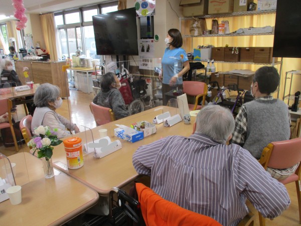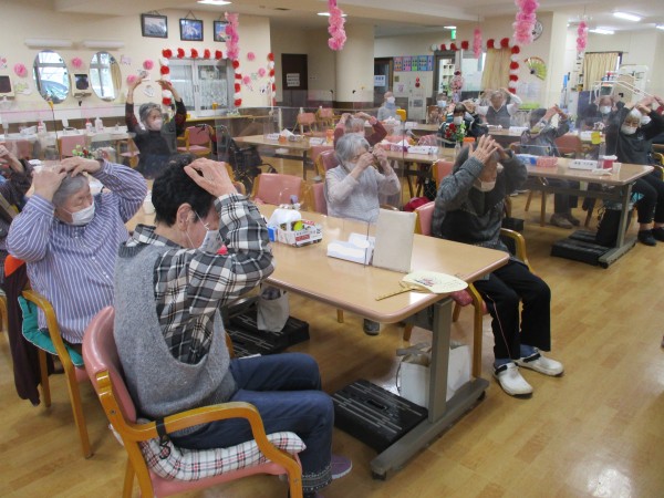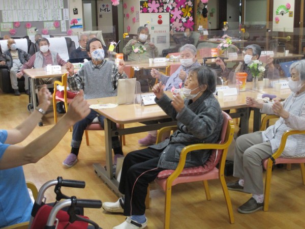 軽快な音楽に合わせて、手足を動かしたり、リズムに乗って全身を動かしたり…。いつもとは少し違う運動に、皆様、ノリノリで参加されていらっしゃいました。