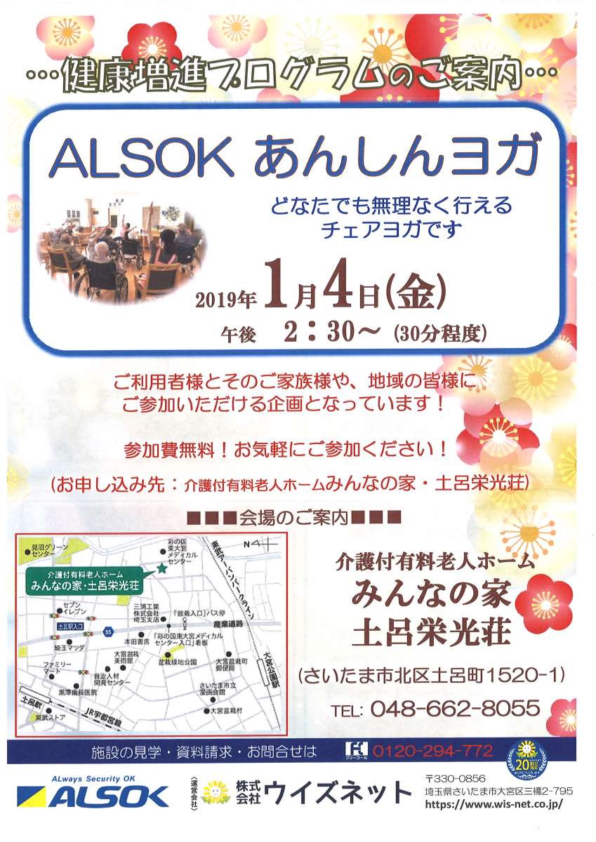 ◎介護付有料老人ホーム みんなの家・土呂栄光荘で、1月4日 14:30~15:00に ”ALSOKあんしんヨガ”を開催致します。どなたでもご自由に参加できます。お気軽にお越しください。