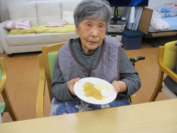 今日のおやつは、手作りの林檎コンポートでした。