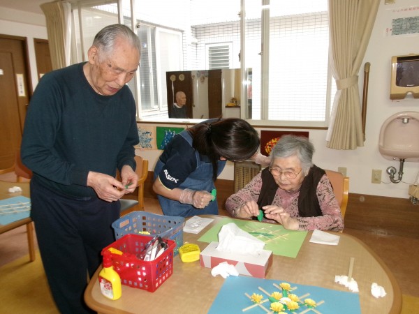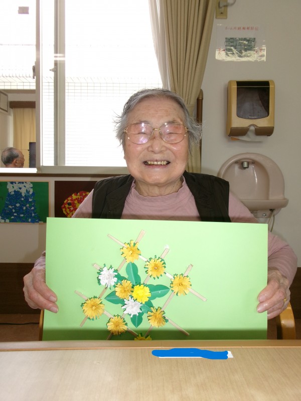 画用紙に割箸を貼り付け、葉・たんぽぽの花を
