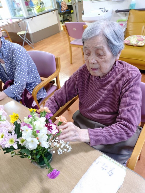 1階のデイサービスの利用者さんと共に…ピンクのバラやオレンジ色のカーネーションなどがあり、お部屋全体がとても華やかになりました。(5月になればあっという間に母の日ですね)