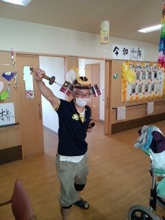 ホーム長手作りの兜をつけた