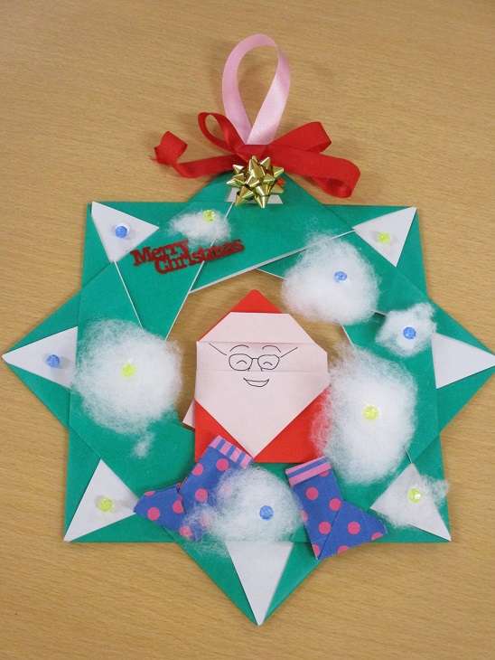 サンタクロース、長靴を折り紙で作り画用紙をお星さまの形に切り抜いて、雪にみたてたわたも貼って頂くと、かわいいリースが出来上がりました❤