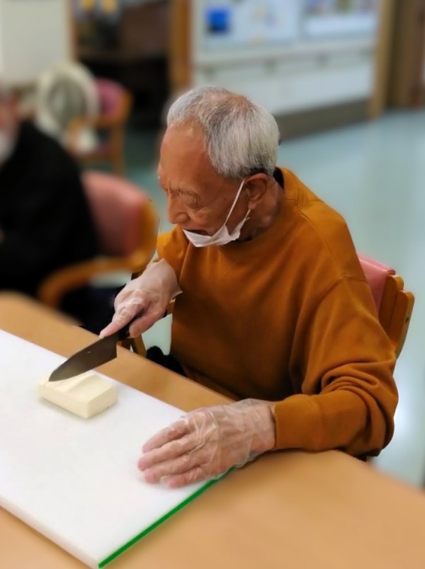 事前に職員が水抜きをした木綿豆腐とこんにゃくを1.5㎝位の幅で切って頂き