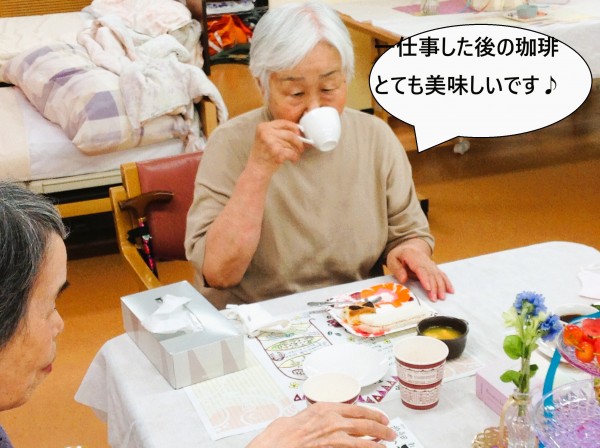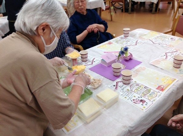 完成しましたー♪今回は季節のさくらんぼとスイカを追加してアフタヌーンティーを行いました。『初物75日』という言葉がありますが、初物を食べて寿命が75日伸びたわと喜ばれるご利用者様もいらっしゃいました。