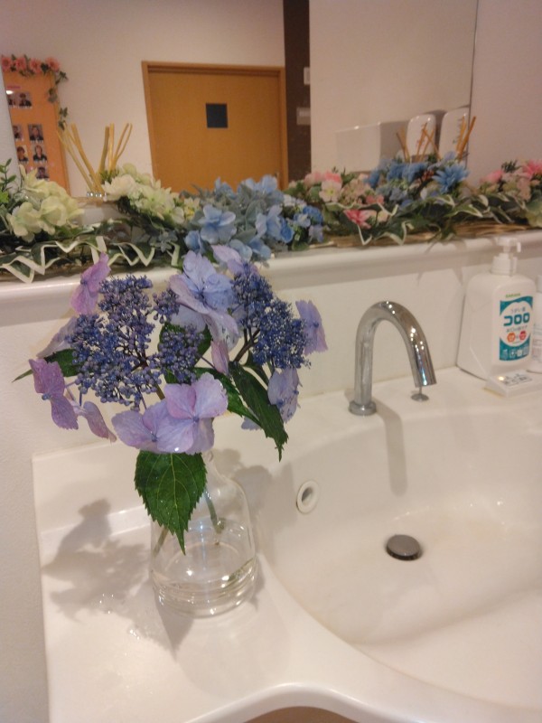 そんな中、施設の敷地内にアジサイがきれいに咲いているのを見つけたので少し拝借し施設内で飾らせてもらいました(#^.^#)