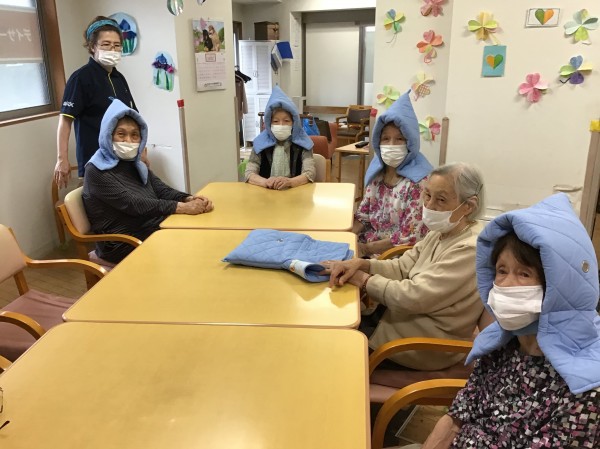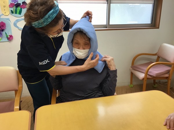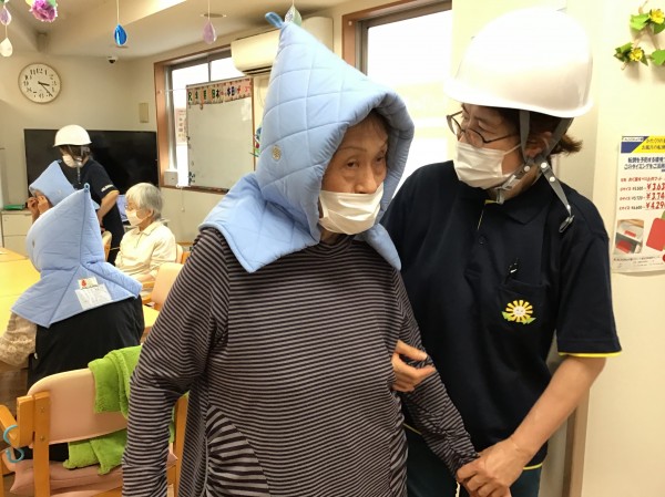 まずはきっちりと防災頭巾を被る練習です(#^^#)