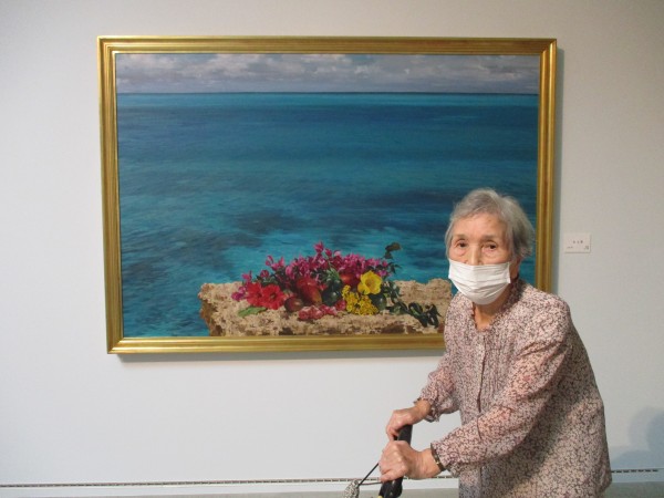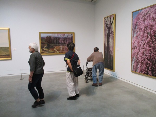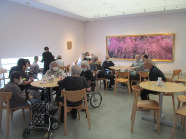 館内には、現代リアリズムの巨匠・三栖右嗣氏の迫力ある絵画が数多く展示されており、その写実的で力強い作品に、皆様じっくりと見入っておられました。「この果物の絵、写真みたい!」「花の絵がとても印象的だった」と感性豊かな感想が飛び交い、会話も弾みました。そして何よりも印象的だったのは、作品を眺めながらカフェで頂くおはぎと飲み物!アートと甘味の贅沢な組み合わせに、「絵を見ながら食べるおはぎなんて初めて」「これは最高ね」と皆様大満足のご様子でした。記念撮影ではお気に入りの作品を背景にパシャリ!帰りの車内でも、「また行きたいね」と嬉しい声が聞かれました。