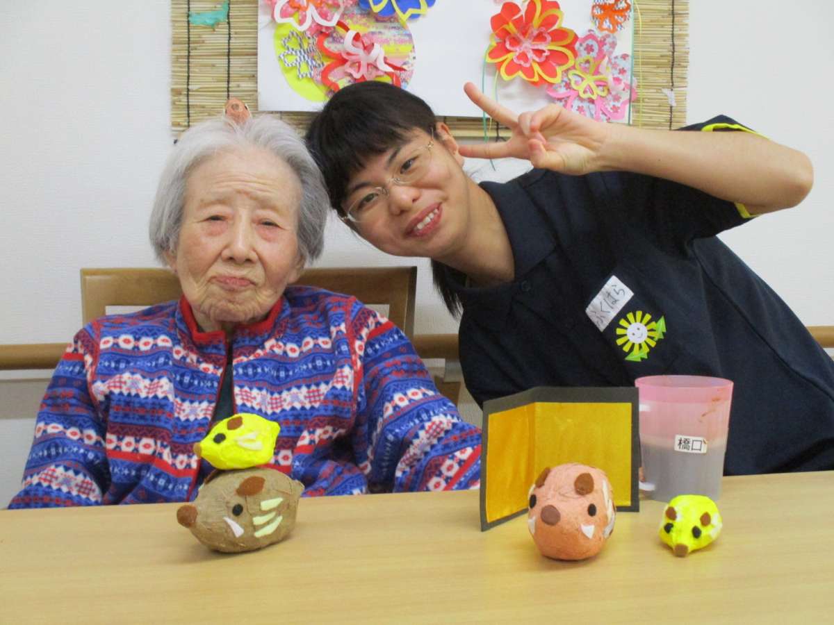 手にしているのは、入居者様手作りの「イノシシ」です。机の上に何匹も!