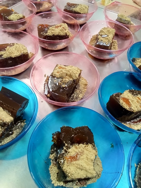 1日目は黒糖ゼリーのきな粉添えです。黒糖はミネラル・ビタミンが豊富です。