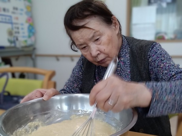 ご入居者様おふたりが、交互に混ぜて生地を作ってくださいました。