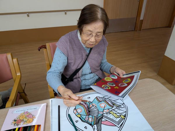 「好きにドンドン押しちゃってください」の言葉で表情が柔らかくなり、楽しく色を重ねていきます。
