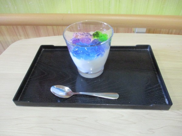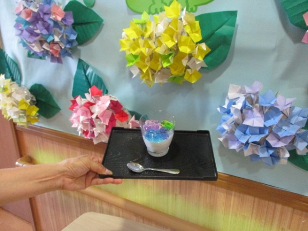 汗をかいた後のおやつはパティシエ(職員)手作り紫陽花ゼリーでひと息(*^-^*) 美味しそうですね ご覧いただきありがとうございました。ケアスタッフでした。
