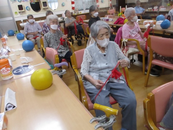 この日は、セラバンドやボールを使って、全身をしっかりと動かしました。セラバンドは、筋肉の維持・向上に効果的で、特に腕や肩まわりの筋肉を無理なく鍛えることができます。また、伸び縮みの感覚を利用して、関節の可動域を広げることにもつながります。