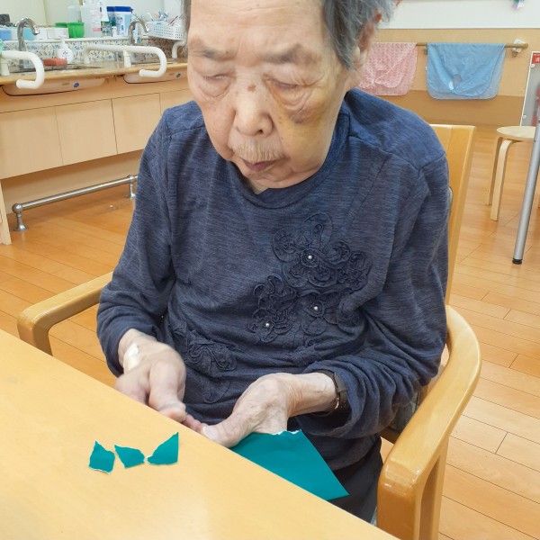 折り紙をちぎり、のり付けをして