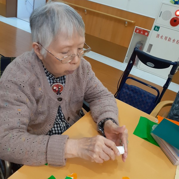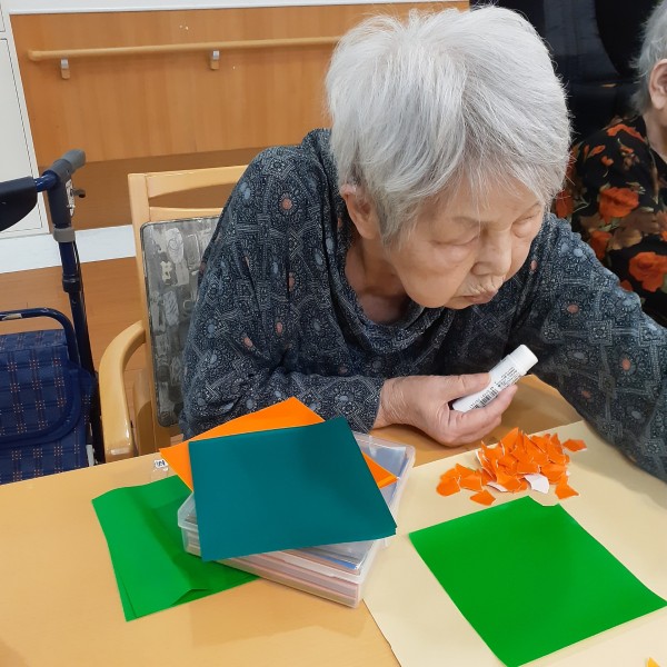 折り紙をちぎり、のり付けをして