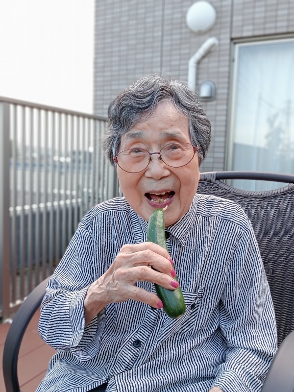 夏の太陽の光をたくさん浴びてよく実ったキュウリです。施設の皆様の水やりのおかげです。いつもありがとうございます。