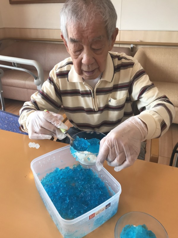 サイダーにかき氷シロップ(ブルーハワイ)で混ぜてゼラチンで固めてゼリーを作ります。