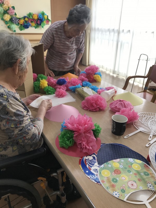 今回は、盆踊りで使います花笠作りの様子をご紹介させていただきます。