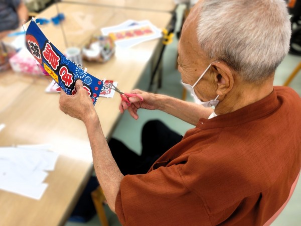 夏祭りに向けて印刷した飾りをハサミで切り抜いてももらい