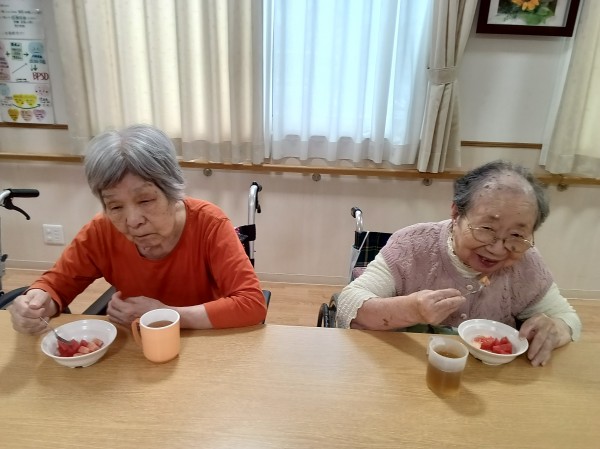 畑で採れた小玉スイカ、今年初挑戦で6個の収穫でした♪各フロアで順番に分けて1Uでは最後のスイカを食べましたლ(´ڡ`ლ)桃の差し入れもあり豪華なおやつになりましたね(´~`)モグモグ