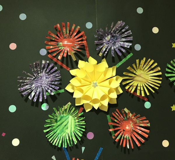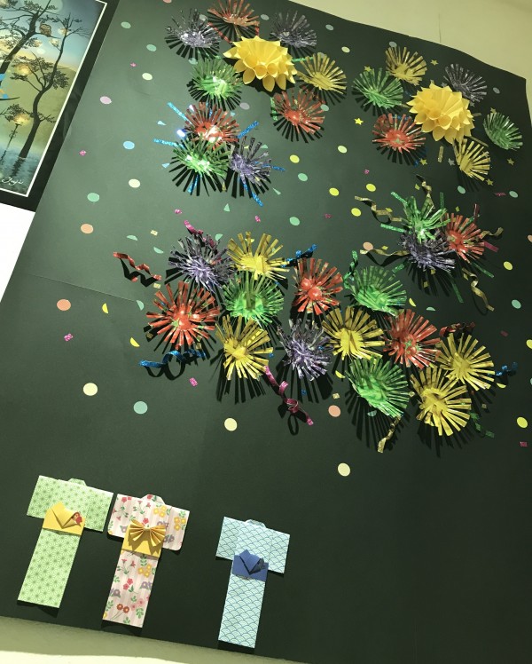 用紙に花火に合ったキラキラのシールを皆様に貼って頂いたりして