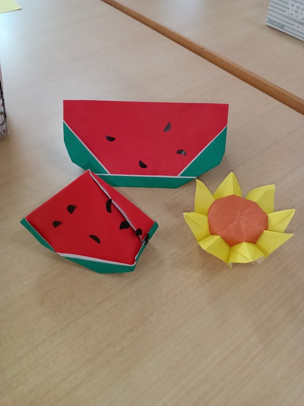 前回は鶴で、今回は夏らしい向日葵と西瓜の折り紙を教えて下さいました!