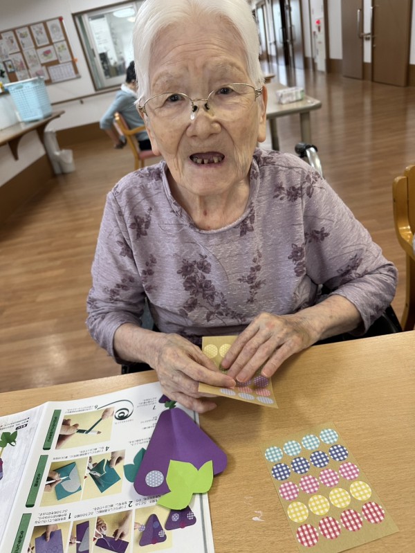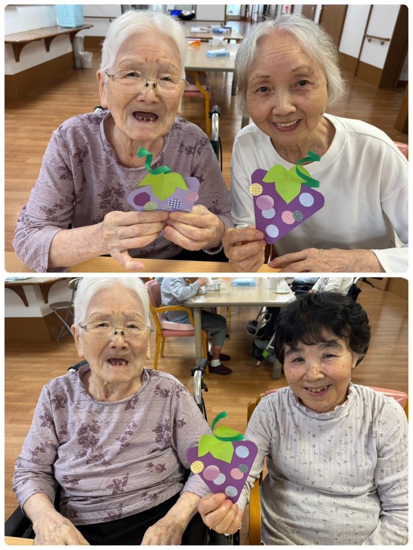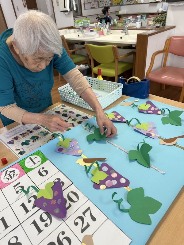 型紙を使った葡萄の台紙に、粒←様々な柄のシール。をバランスを考えながら貼っていただきます。
