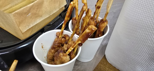 焼き鳥を、スタッフさんが一生懸命仕込んでくださいまして、