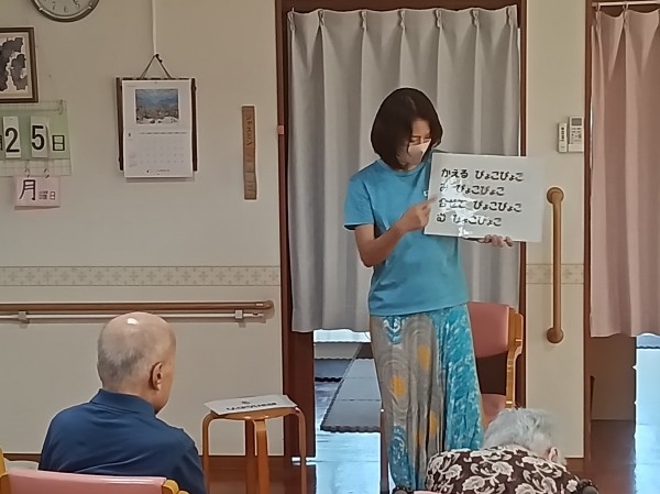 体操前に試した早口言葉、「かえるぴょこぴょこ みぴょこぴょこ あわせてぴょこぴょこ むぴょこぴょこ」では、少し苦戦されたご利用者様も、体操の後にははっきりと発音できるようになり、周りから拍手が起こる場面もありました!