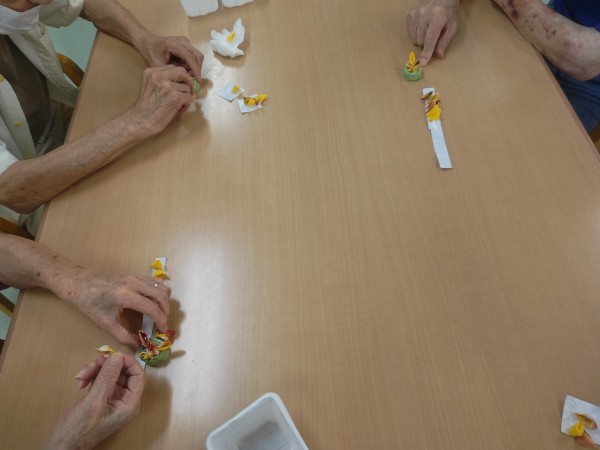 職員が事前につまんでおいたちりめんを土台に順番に貼り付けていただくこと3周!